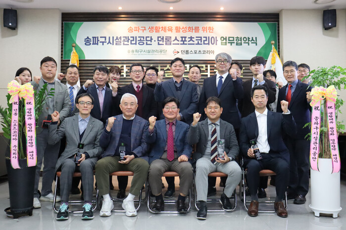 [시민일보 = 이대우 기자] 송파구시설관리공단(이사장 황대성)은 지난 1월10일에 던롭스포츠코리아(주)(이하“던롭”이라 한다) 홍순성 대표와 송파구 테니스 생활체육 활성화를 위한 공동협력 업무협약(MOU)식을 가졌다.