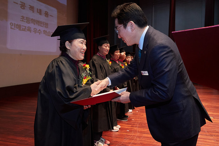| ▲ 박경귀 시장이 초등학력 졸업장을 받은 노인에게 표창장을 수여하며 악수를 하고 있다. (사진=아산시청 제공) |