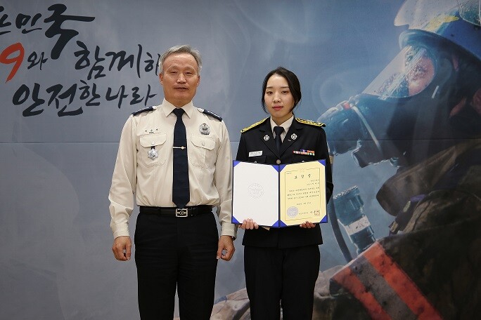 이번 표창 대상자는 지난 4일 대구광역시 소재의 한 음식점에서 식사 중 옆 테이블 덕트 배관에서 화재가 발생한 것을 목격하고 본인 차량으로 달려가 가지고 있던 소화기 2대를 이용해 초기 진화로 큰 피해를 막은 정다솜 소방사이다.