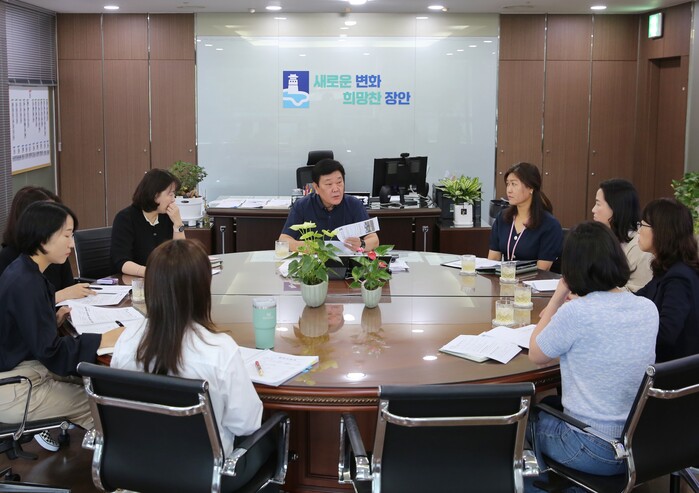 경기 수원시 장안구가 지난 23~25일 3일간, 수원 대전환의 효과적인 추진과 28만 장안구민의 삶의 질 향상을 위한 ‘2025년 장안구 주요업무계획 보고회’를 개최했다. 사진은 이상수 구청장(가운데)이 관계자들과 의견을 나누고 있는 모습. (사진=장안구청 제공)