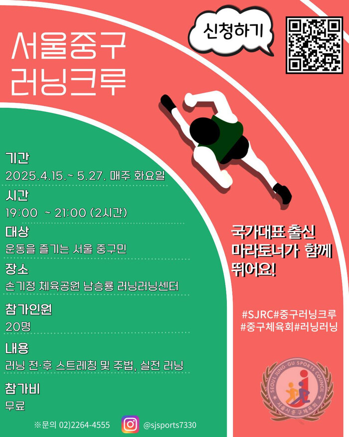 [시민일보 = 여영준 기자] 중구는 서울 도심의 아름다움을 만끽하며 건강한 삶을 함께 나눌 <제1기 중구 러닝크루>로 참가할 중구민 20명을 모집한다고 10일 밝혔다.