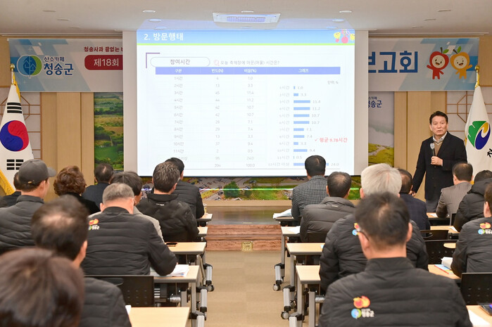 이날 보고회는 윤경희 청송군수를 비롯하여 김양태 축제추진위원장, 심상휴 군의장, 축제추진위원 및 집행위원, 사과협회회장단, 농업인단체회장단, 축제참여단체 대표 등이 참석하여 청송사과축제에 대한 평가를 통해 청송사과축제의 현 위치를 확인하고 다양한 분야의 건의사항과 의견을 모아 축제 발전방안을 모색하는 자리가 되었다.