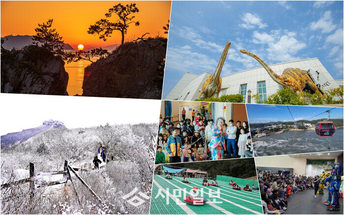 | ▲ 상단 왼 쪽부터 시계 방향 송지 땅끝 맴섬 일출, 우황리 공룡박물관, 울돌목 해상케이블카, 공룡박물관 공연 모습, 두륜산 케이블카 사계절 썰매장, 두륜산 설경 / 자료사진 해남군 제공 |
