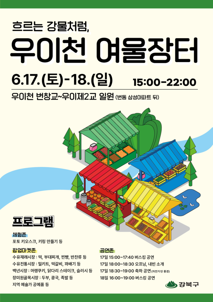 [시민일보 = 홍덕표 기자] 서울 강북구(구청장 이순희)가 전통시장 및 지역상권 활성화 사업의 일환으로 오는 17~18일 우이천 번창교 일대에서 '우이천 여울장터'를 개최한다.