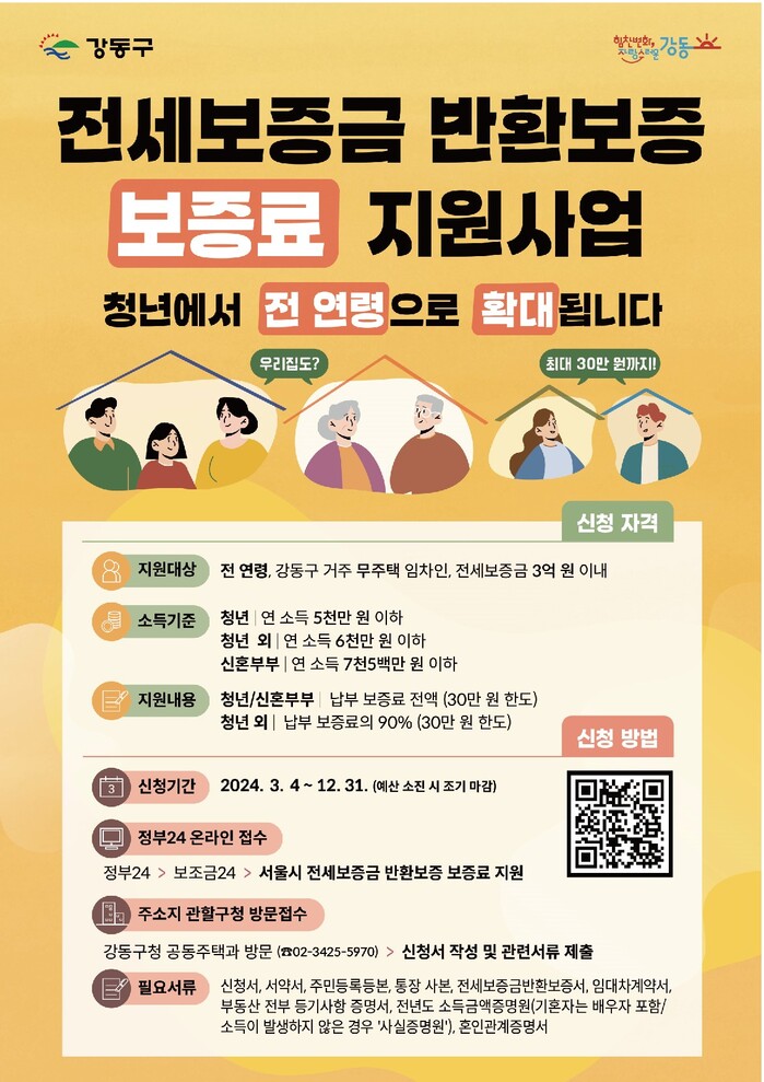 신청 방법의 경우 온라인 접수는 정부24 홈페이지 ‘서울시 전세보증금 반환보증보증료 지원’ 검색을 통해 가능하고, 강동구청 공동주택과로 방문 접수하면 된다.