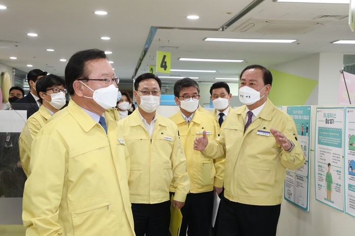 유동균 서울 마포구청장이 김부겸 국무총리와 지난 9일 서울 마포구 보건소를 방문해 보건소 코로나19 근무현장을 돌아보고, 수도권 보건소장 현장간담회를 열었다. 사진은 김 총리(왼쪽)에게 유 구청장(오른쪽)이 보건소 코로나19 대응 현황을 설명하는 모습. (사진제공=마포구청)