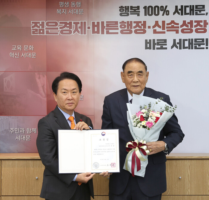 | ▲ 명예사회복지공무원으로 활동해 온 공적을 인정받아 최근 보건복지부 장관 표창을 받은 유규상 서대문구 충현동 지역사회보장협의체 위원장이 이성헌 구청장(왼쪽)과 함께 기념 촬영을 하고 있다. (사진=서대문구청 제공) |