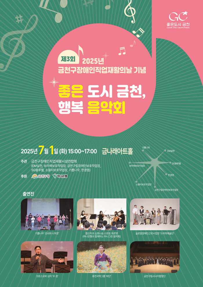 [시민일보 = 여영준 기자] 서울 금천구(구청장 유성훈)가 1일 오후 2시30분 금나래아트홀에서 ‘제3회 금천구 장애인직업재활의 날’을 맞아 ‘좋은 도시 금천, 행복 음악회’ 행사를 개최한다고 밝혔다.