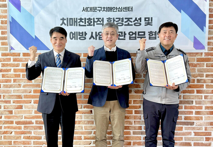 | ▲ 실종예방 실버벨 업무협약식 모습. 왼쪽부터 유명선 신촌동장, 김어수 서대문구치매안심센터장, 최진영 신촌지구대장. (사진=서대문구치매안심센터 제공) |