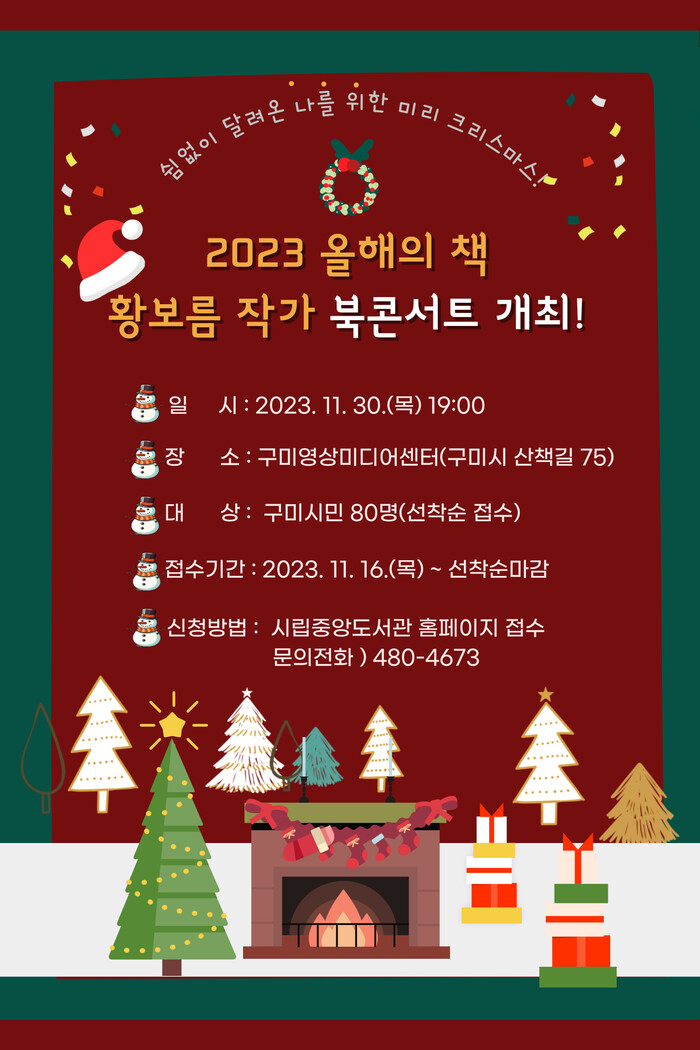 [구미=박병상 기자] 경북 구미시가 오는 30일 영상미디어센터에서 2023 올해의 책 일반부문 ‘어서오세요, 휴남동서점입니다’의 황보름 작가를 초청해 힐링을 주제로 감성 북콘서트를 개최한다.