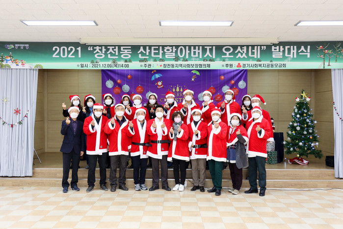 경기 이천 창전동행정복지센터가 9일 창전동 지역사회보장협의체 주관으로 2021년 창전동 '산타할아버지 오셨네' 발대식 및 산타선물 전달 행사를 열었다. 이 행사는 매년 크리스마스 즈음에 저소득층 아동·청소년들의 소원을 접수해 이뤄주는 후원행사다. 사진은 발대식에서 엄태준 시장(앞줄 왼쪽 다섯 번째)이 관계자들과 기념촬영을 하는 모습. (사진제공=이천시청)