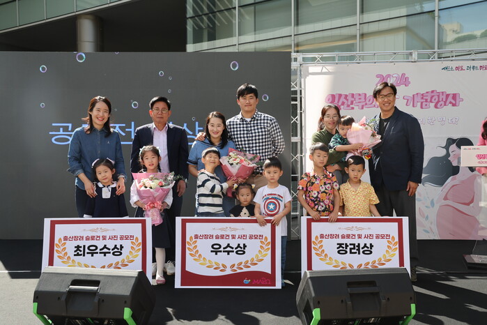 서울 마포구가 최근 구청 한마음광장에서 '임산부의 날 기념행사'를 개최했다. 사진은 '출산 장려 슬로건 및 사진 공모전'의 수상자들과 박강수 구청장(왼쪽 두 번째)이 기념촬영을 하고 있는 모습. (사진=마포구청 제공)
