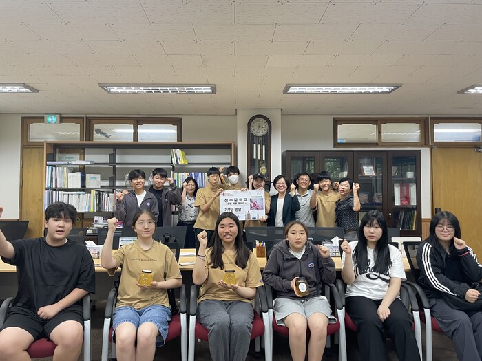 22일 구에 따르면 이번 성금은 성수중학교 '꿀벌 제빵 동아리' 학생들이 지난 3~6월 도시 양봉 활동을 통해 자체적으로 마련한 것으로, 이날 전달식에는 동아리 학생 12명이 참여했다.