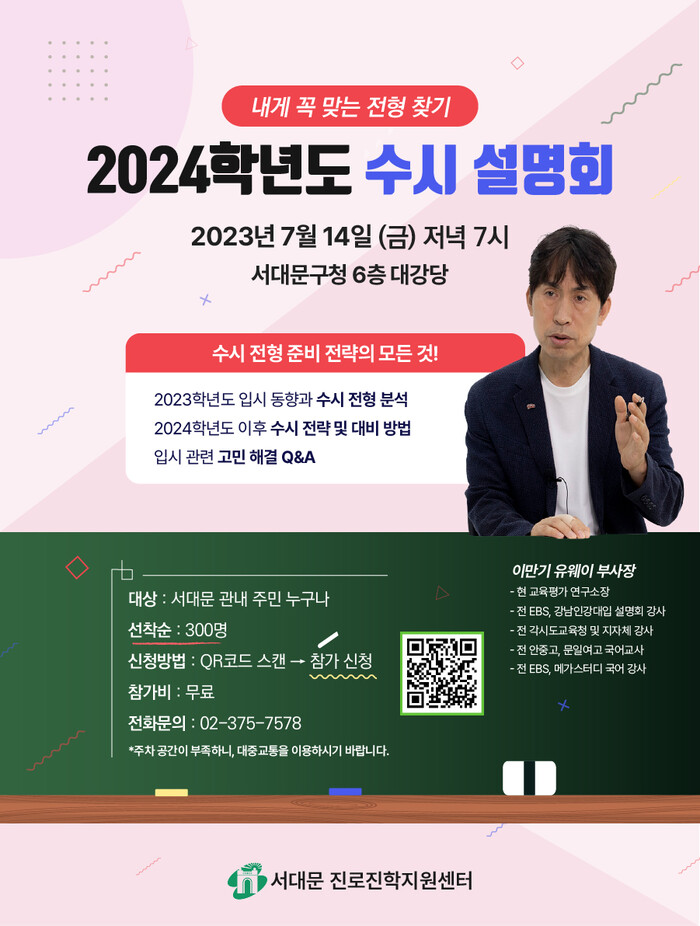 [시민일보 = 홍덕표 기자] 서울 서대문구(구청장 이성헌)가 2024학년도 대입 수시전형을 준비하는 지역내 수험생과 학부모를 위해 오는 14일 '대입 수시 지원 전략 설명회'를 개최한다.
