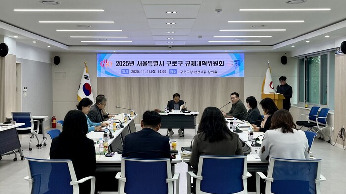 서울 구로구가 11일 구청 본관 3층 창의홀에서 ‘2025년 구로구 규제개혁위원회’ 회의를 열고, 민간 전문가와 협력해 불합리한 자치법규 개선에 나섰다. 사진은 최원석 부구청장(가운데)과 관계자들이 회의를 진행하는 모습. (사진=구로구청 제공)
