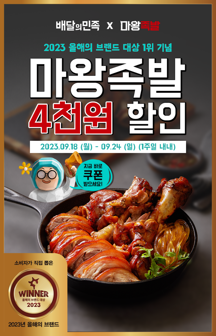 바베큐 족발 브랜드 마왕족발이 9월 18일부터 9월 24일까지 ‘2023 올해의 브랜드 대상’ 수상 기념 배달의 민족 4천 원 할인 프로모션을 진행한다고 밝혔다.