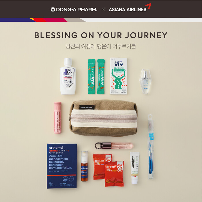 프리미엄 멀티 비타민 오쏘몰, 이너뷰티 브랜드 아일로, 프로바이오틱스 브랜드 락토바이브, 구강청결제 가그린 등 동아제약의 8개 인기 품목을 한 번에 만나볼 수 있는 기회이다. 제품을 담은 파우치는 다양한 여행용품을 휴대할 수 있는 넉넉한 사이즈로 아시아나항공의 메인 컬러인 브라운을 적용했다.