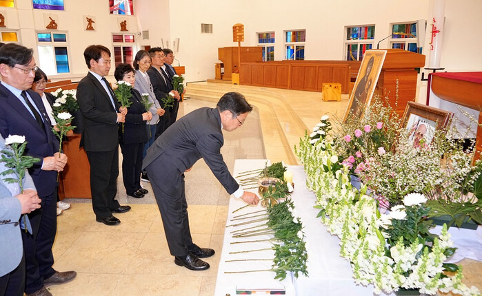 [광주=정찬남 기자] 강기정 광주광역시장이 24일 광주시 실국장들과 천주교 광주대교구청 성당에 마련된 프란치스코 교황 분향소를 찾아 조문하고 있다./광주광역시 제공