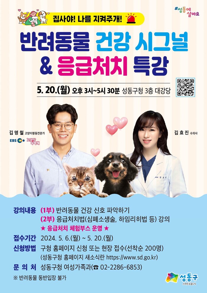 [시민일보 = 변은선 기자] 서울 성동구(구청장 정원오)는 20일 오후 3시 성동구청 3층 대강당에서 '반려동물 건강 시그널 및 응급처치 교육' 특강을 개최한다.