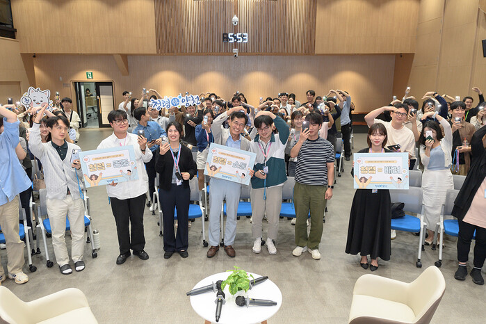 서울 양천구가 최근 ‘구청장과 함께하는 청렴 콘서트’를 개최한 가운데 신규 공무원과 입직 5년 이하의 20~30대 직원 150여명이 참석했다. 사진은 이기재 구청장과 관계자들이 단체 촬영하는 모습. (사진=양천구청 제공)