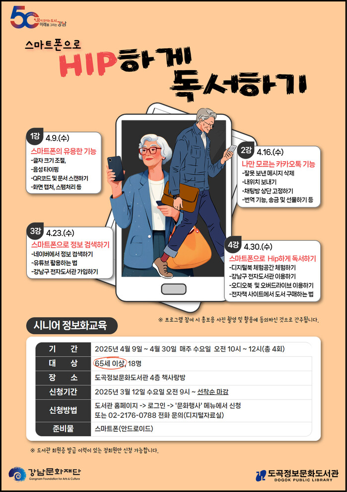 [시민일보 = 이대우 기자] (재)강남문화재단(이사장 이자연)이 운영하는 도곡정보문화도서관에서 65세 이상 시니어를 위한 정보화 교육 ‘스마트폰으로 Hip(힙)하게 독서하기’를 오는 4월 9일(수)부터 4월 30일(수)까지 매주 수요일 총 4회에 걸쳐 운영한다.