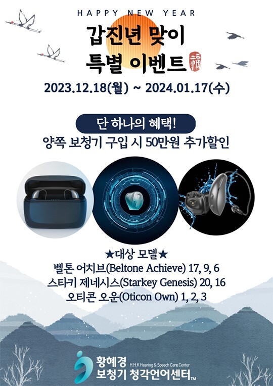 황혜경보청기 청각언어센터 관계자는 “보청기 가격 때문에 최신 보청기 양이 구입을 망설였던 분들께 좋은 기회”라며, “한 쪽으로 들을 때보다 양쪽으로 들었을 때 더 높은 보청기 효과와 만족도를 기대할 수 있으니 신년맞이 이벤트 혜택을 놓치지 않길 바란다”고 전했다.