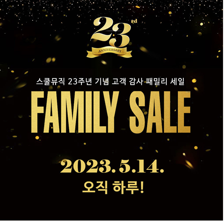 이번 스쿨뮤직 23주년 기념 패밀리세일 행사는 14일(일) 자정부터 24시간 동안 스쿨뮤직 홈페이지에서만 진행되며 오픈마켓과 오프라인 매장에서는 진행하지 않는다.