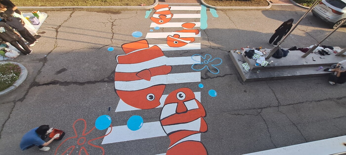 횡단보도는 아이들의 눈높이에 맞춰 바닷속을 헤엄치는 물고기들이 길을 안내하는 형태로 구성됐다.