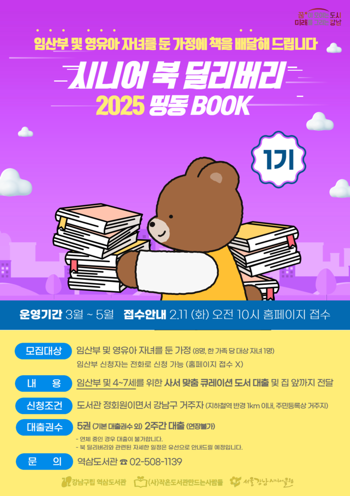 <시니어 북 딜리버리: 띵동 BOOK>은 강남구 내 임산부 및 영유아(4~7세) 가정 8팀을 대상으로 운영되며, 유아들의 독서 성향과 기호를 반영한 추천도서 5권씩을 5회에 걸쳐 가정에 직접 배달한다. 배달된 도서는 정해진 기한 내 수거하여 반납되며 새로운 도서를 배달하는 방식으로 진행되어 가정 내 독서 환경 조성과 도서관 이용 활성화를 돕고 있다.