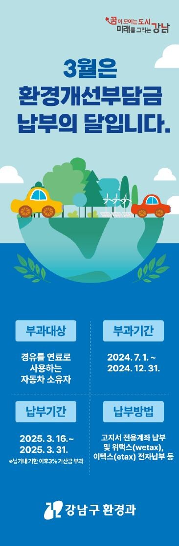 강남구 관계자는 “환경개선부담금은 쾌적한 대기환경을 조성하는 데 중요한 재원으로 활용되고 있다”며 “납부 기한을 놓치면 3%의 가산금이 더해지니 기한 내 납부하셔서 불이익을 받지 않으시길 바란다”고 말했다.