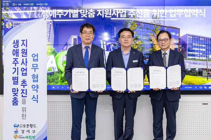 서울 강서구가 최근 진교훈 구청장을 비롯해 김정해 (사)오픈월드 이사장, 문진환 (사)더함께새희망 이사장이 참석한 가운데 구청에서 취약계층 생애주기별 맞춤 지원사업을 위한 업무협약을 체결했다. 사진은 진 구청장(가운데)이 기념 촬영을 하는 모습. (사진=강서구청 제공)