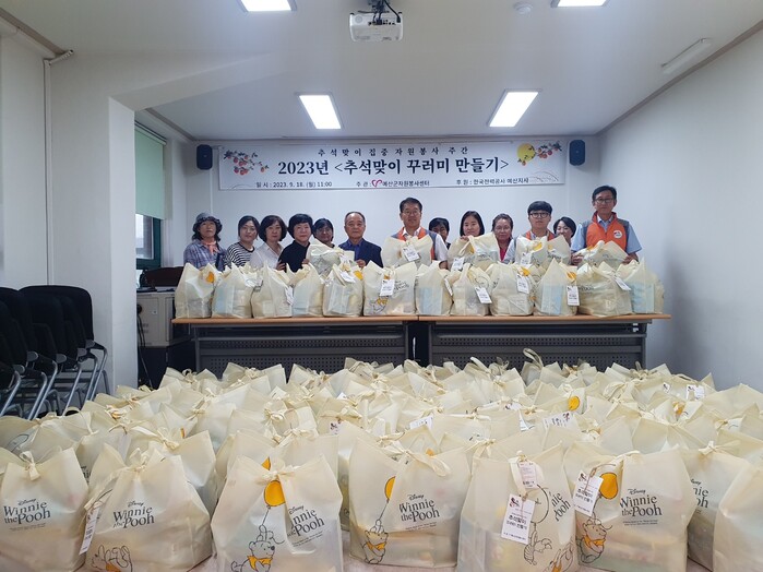 | ▲ 추석 맞이 집중 자원봉사 주간 '2023년 추석맞이 꾸러기 만들기'에 동참한 봉사자들이 꾸러미를 만들고 기념촬영을 하고 있다. (사진=예산군청 제공) |