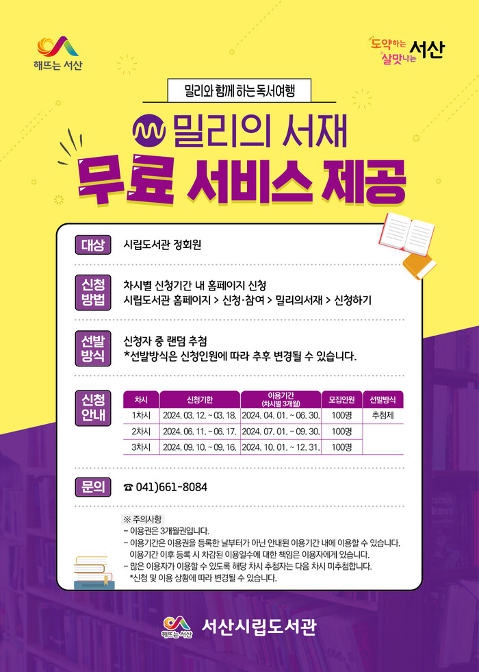 신청 일정은 1~3차시로 구성되며, 1차시 신청 기간은 12~18일까지, 2차시와 3차시는 각각 6월11~17일, 9월10~16일에 서산시립도서관 홈페이지 ‘밀리의 서재’ 게시판에서 신청할 수 있다.