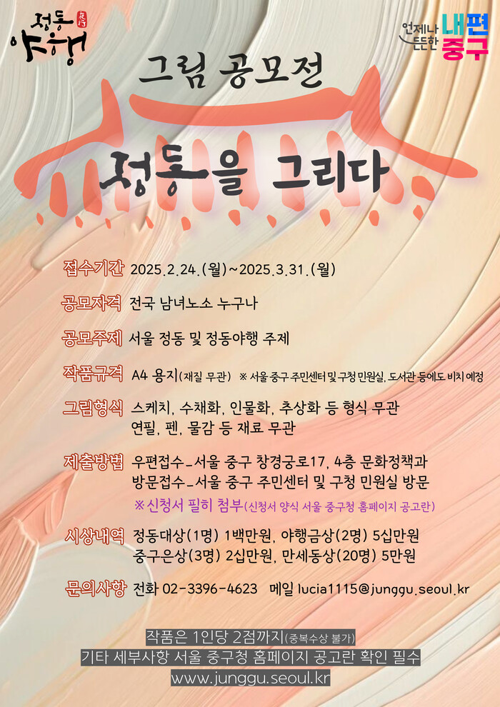 중구 15개 동 주민센터와 구청 1층 민원실, 도서관 등에 배치된 A4 크기의 도화지를 사용해 그림을 그리고 뒷면의 신청서를 작성해 오는 31일 오후 6시까지 동주민센터로 제출하거나 우편(주소: 서울 중구 창경궁로 17, 4층 문화정책과)으로 보내면 된다.