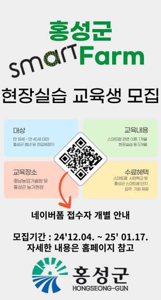모집 기간은 오는 4일부터 2025년 1월17일 오후 6시까지이며, 홍성군농업기술센터 스마트농업팀을 직접 방문하거나 이메일 또는 QR코드를 통해 접수할 수 있다.
