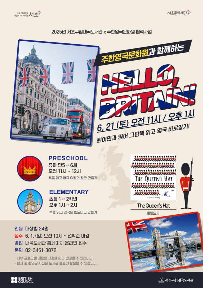 [시민일보 = 박소진 기자] 서초문화재단 내곡도서관은 주한영국문화원과 함께 오는 21일 어린이 대상 영어문화 체험 프로그램 ‘Hello, Britain’을 운영한다.