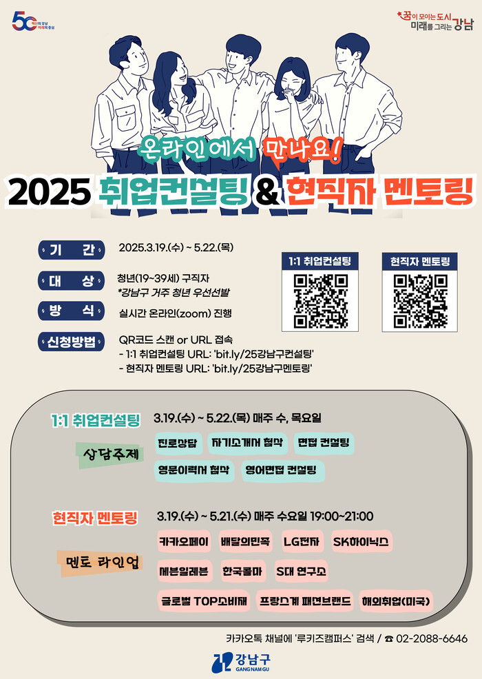 조성명 강남구청장은 “현장에서 실무 능력을 갖춘 인재를 선호함에 따라 청년들의 취업이 갈수록 어려워지는 현실을 반영해 더욱 내실 있는 컨설팅·멘토링 프로그램을 준비했다”며 “앞으로도 청년들이 빠르게 변화하는 고용 시장에서도 경쟁력을 갖고 적성에 맞는 일자리를 찾을 수 있도록 다양한 기회를 마련하겠다”고 말했다.
