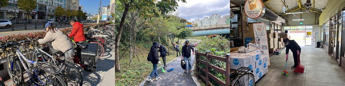 | ▲ 왼쪽부터 방치자전거 단속, 구파발 천 환경정비, 전통시장 환경정비 모습. (사진=은평구청 제공) |