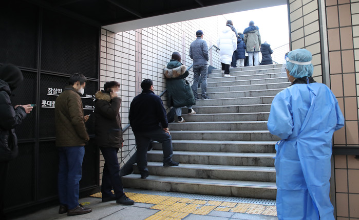 8일 오전 서울 송파구 송파보건소 코로나19 선별진료소 앞 지하도에서 시민들이 검사를 받기 위해 줄을 서 있다. 중대본 회의에서 김부겸 국무총리는 "8일 코로나19 신규 확진이 7000명을 넘어섰다"라고 밝혀 팬데믹 이후 최다 확진자를 기록할 것으로 보인다.