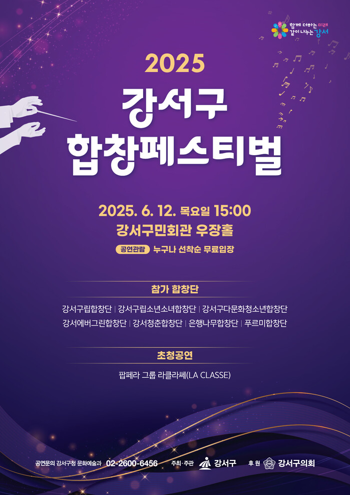 한편 강서구 합창페스티벌은 ‘합창을 통한 화합’이라는 취지 아래 합창의 보급과 대중화를 위해 2014년 처음 시작돼 올해로 7회를 맞는다.