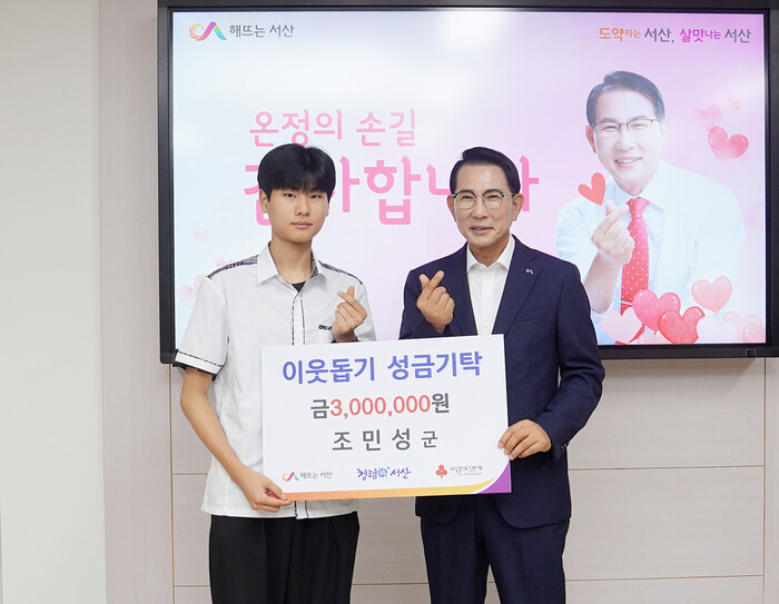 [서산=최복규 기자] 충남 서산시는 조덕래씨와 그의 아들 조민성군이 지역사회에 온정을 전하기 위해 지난 9일 300만원의 성금을 기탁했다고 밝혔다.