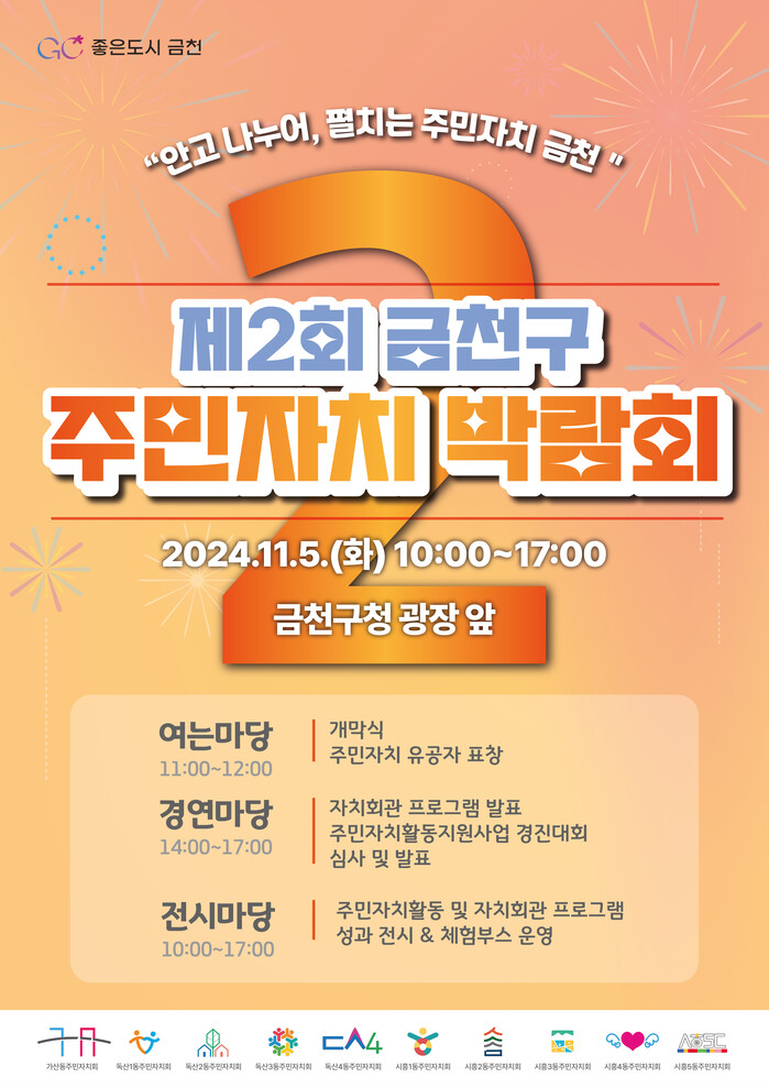유성훈 금천구청장은 “이번 박람회가 금천구 주민자치회의 활동을 널리 알리고, 서로의 성과를 공유하며 학습하는 기회의 장이 되기를 바란다”고 전하며, “앞으로도 주민자치회가 지속적으로 성장할 수 있도록 행정적 지원을 아끼지 않겠다”고 밝혔다.