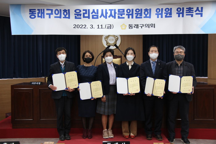 동래구의회(의장 주순희)는 지난 11일 본회의장에서 윤리심사자문위원회 위원에 대해 위촉식을 개최하고 한층 더 높은 책임성을 갖춘 의회로의 새 출발을 다짐했다고 밝혔다.