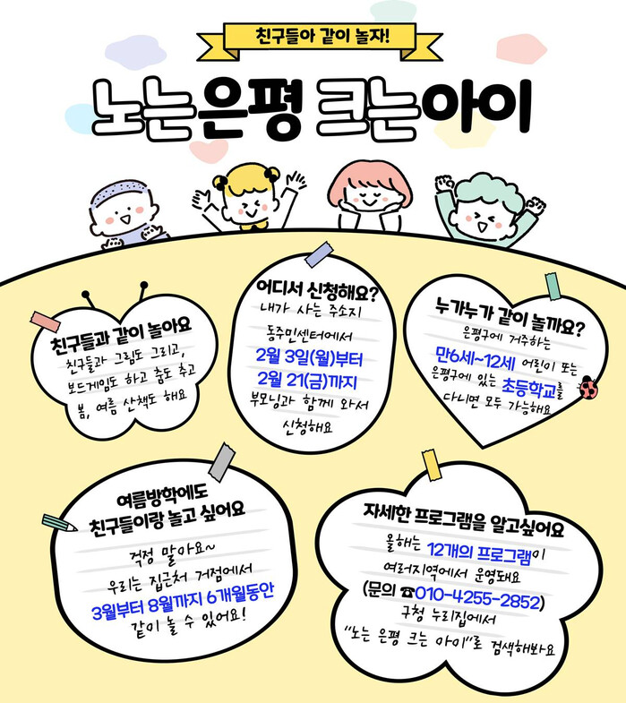 [시민일보 = 이대우 기자] 은평구(구청장 김미경)는 3일부터 오는 21일까지 ‘노는 은평, 크는 아이’ 이용자를 모집한다고 밝혔다.