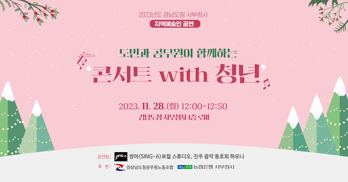 점심시간을 활용해 50여분간 진행될 이날 공연은 서부청사 직원, 인재개발원 교육생과 지역주민이 함께 작은 음악회에 참여해 힐링과 유대를 강화하고, 지역 청년 예술인들에게 좀 더 많은 공연 기회를 제공하기 위해 마련되었다. 공연은 서부청사를 이용하는 누구나 자유롭게 관람이 가능하다.