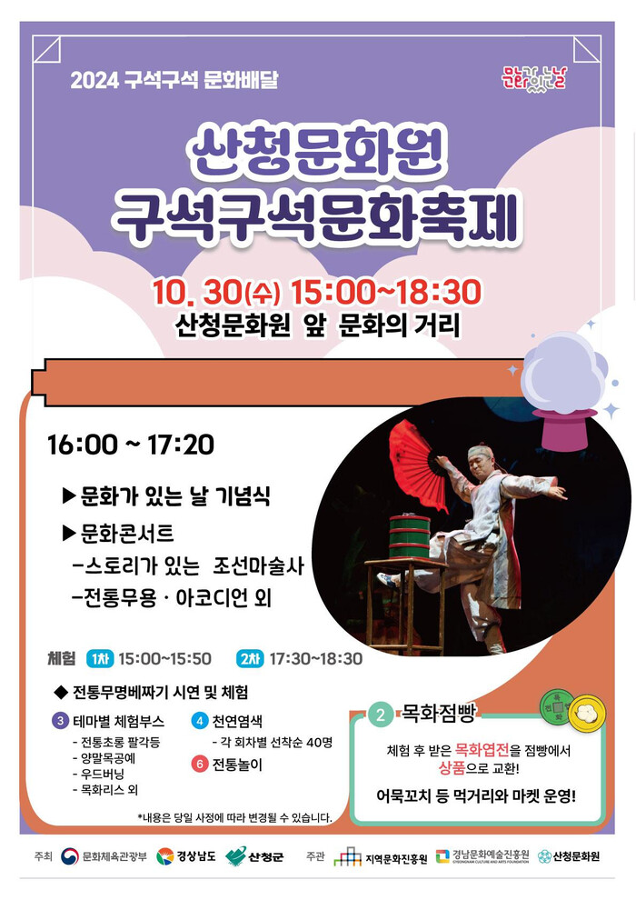 또 스토리가 있는 조선마술사의 마술공연, 산청문화원 전통무용, 아코디언과 색소폰 연주도 마련됐다.