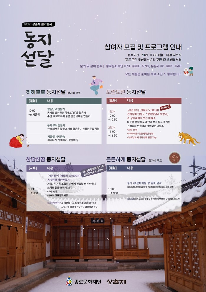 [시민일보 = 이대우 기자] 서울 종로구는 ‘동지(冬至)’를 맞아 겨울 정취를 만끽하며 우리 전통문화를 경험할 수 있는「2021 상촌재 절기행사-동지섣달」행사를 연다.