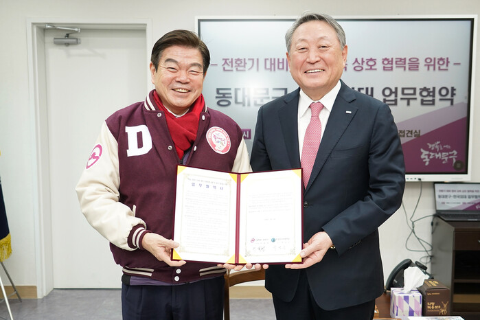 | ▲ 초·중등 전환기 영어 교육 강화를 위한 업무 협약식(왼쪽부터 이필형 동대문구청장, 박정운 한국외대 총장). (사진=동대문구청 제공) |