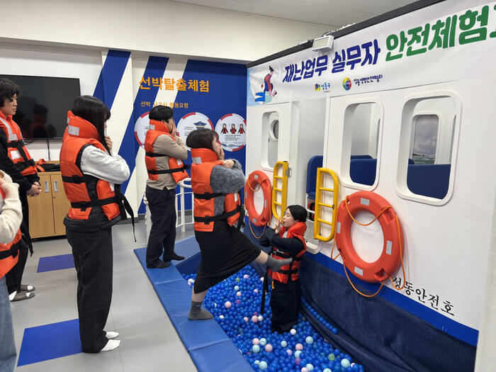 서울 성동구가 최근 성동생명안전배움터에서 재난안전대책본부 등 재난 담당 공무원 대상으로 ‘재난업무 실무자 안전체험교육’을 실시했다. 사진은 교육에 참여한 공무원들이 선박 사고 시 생존 요령을 배우는 모습. (사진=성동구청 제공)