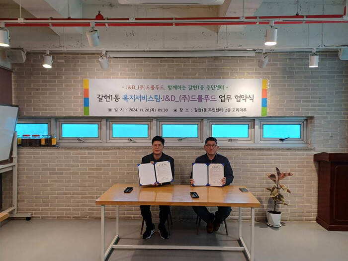 [시민일보 = 이대우 기자] 은평구(구청장 김미경) 갈현1동은 지난달 28일 J&D_주식회사 드롤푸드와 관내 저소득층 장애인지원을 위한 업무협약을 체결했다고 밝혔다.